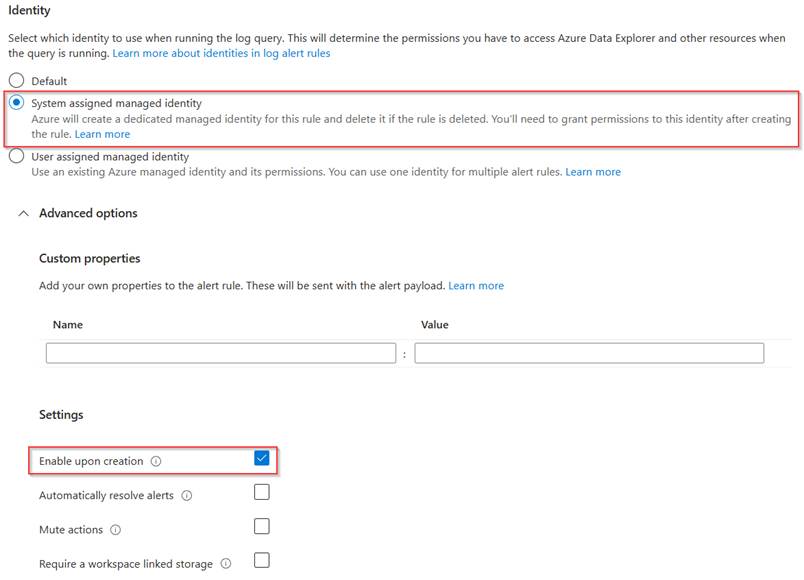 Once the alert rule details are configured, scroll down and make sure to select ‘system assigned managed identity’, this identity will be created and need to be provided permissions separately to run this alert rule to query log data in the log analytics workspace. This way we not only make sure to use the least privilege concept, but also from a housekeeping perspective this is a good solution when this alert rule is deleted, the permissions are being deleted as well.
