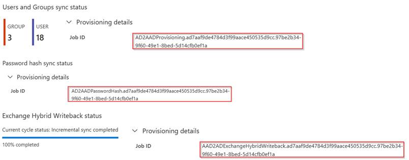 AADProvisioningLogs| where JobId contains "AD2AADProvisioning.ad7aaf9de4784d3f99aace450535d9cc.97be2b34-9f60-49e1-8bed-5d14cfb0ef1a" or JobId contains "AD2AADPasswordHash.ad7aaf9de4784d3f99aace450535d9cc.97be2b34-9f60-49e1-8bed-5d14cfb0ef1a" or JobId contains "AAD2ADExchangeHybridWriteback.ad7aaf9de4784d3f99aace450535d9cc.97be2b34-9f60-49e1-8bed-5d14cfb0ef1a"| where ResultType == "Failure" or ResultType == "Warning"| extend ProvisioningSteps = parse_json(ProvisioningSteps)| project TimeGenerated, ResultType, Action, tostring(ProvisioningSteps.[0].details.displayName), tostring(parse_json(StatusInfo).Reason)