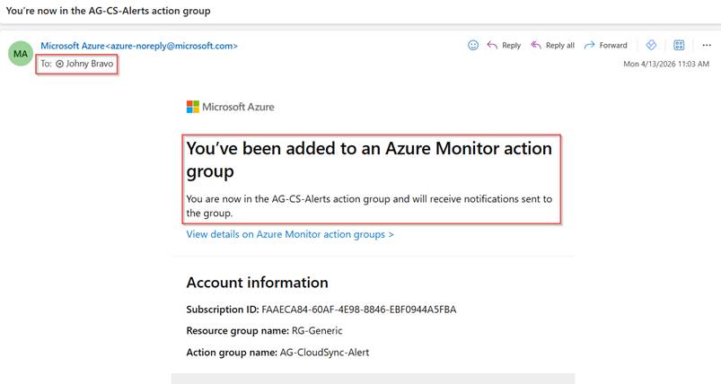 Now the alert rule has been created, let’s validate if the rule is working correctly. So first let’s sign in to the email of Johny Bravo. As we can see during the configuration of the action group an email has been sent out to Johny notifying him about the fact that he has been added to an Azure Monitor Action Group.
