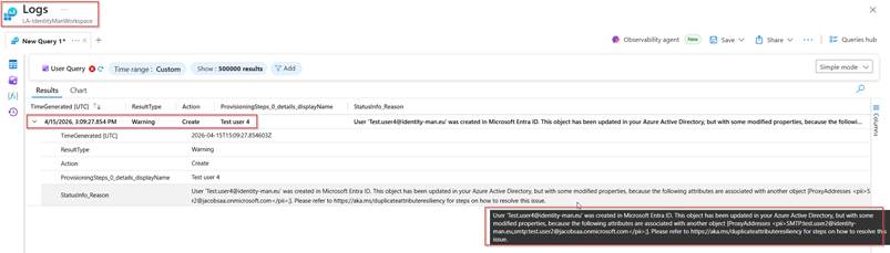With that a browser will open and (if you have permissions) will show you the exact same error message as shown in the provisioning logs but now shown in log analytics. In this case we can see that the proxyaddress ‘test.user2@identity-man.eu’ is already being used and couldn’t be written to the object(s) in Entra ID.