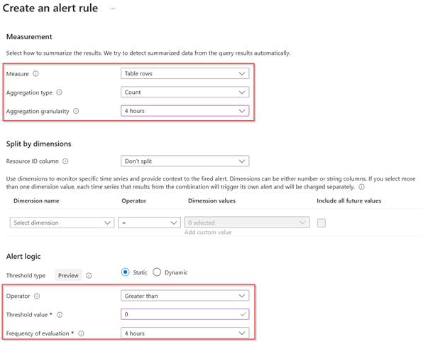 Once the query has been altered correctly, scroll down and make sure the ‘measurement settings’ are configured and configure the ‘alert logic’. The measurement is looking at a count value, and the alert logic is checking each 4 hours whether the count value is greater than 0 with the settings shown below. This means the rule will check each four hours if there is a result based on the log query in log analytics, if this is the case this alert rule is being triggered. Once ready hit ‘Next’.