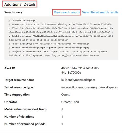 If you scroll a bit more down to the ‘Additional details’ in the email there is a button ‘View search results’, which will show exactly on which failures and warnings this alert rule has been triggered.
