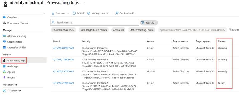 Of course, this is rather a notification than an alert, and as my configuration is healthy, let’s make it unhealthy by going to Active Directory User and Computers and adding a few new accounts with duplicate ProxyAddress values. After some time (in most cases minutes) the cloud sync agent will pick up these changes and tries to synchronize them to Entra ID. As expected, there are duplicate values which now triggers warnings and failures in the provisioning logs.