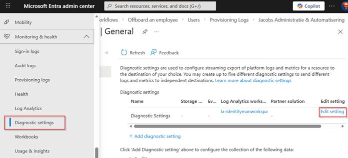 Our first step is to make sure the logging is available in a log analytics workspace. For that go to the Entra Admin Portal, go to ‘Monitoring & Health’, select ‘Diagnostic settings’ and either ‘add a diagnostic setting’ or hit ‘edit setting’ on a current active configuration.